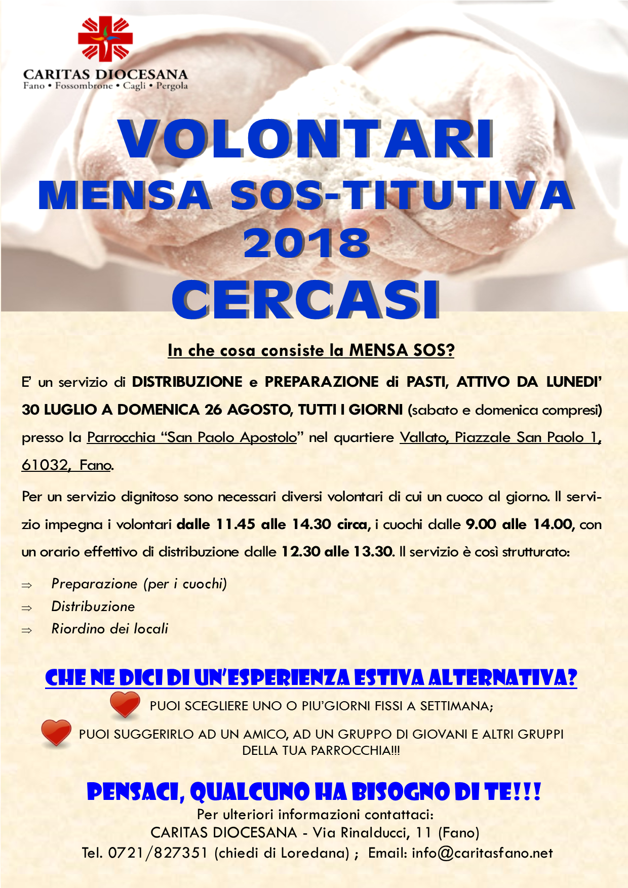 Anche quest’anno la Caritas Diocesana cerca volontari per la Mensa SOS-titutiva. Si tratta di un servizio di distribuzione e preparazione dei pasti attivo tutti i giorni nel mese di agosto (sabato e domenica compresi) presso la parrocchia di San Paolo Apostolo al Vallato (piazzale San Paolo 1). Per un servizio dignitoso sono necessari diversi volontari di cui un cuoco al giorno in regola con la normativa HACCP. Il servizio impegna i volontari dalle ore 11.45 alle ore 14.30 circa, i cuochi dalle ore 9 alle ore 14 con un orario effettivo di distribuzione dalle ore 12.30 alle ore 13.30. Il servizio è così strutturato: inizio preparazione (per i cuochi), distribuzione, riordino dei locali. E’ possibile scegliere uno o più giorni fissi alla settimana.