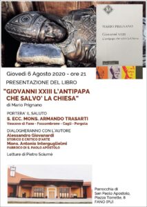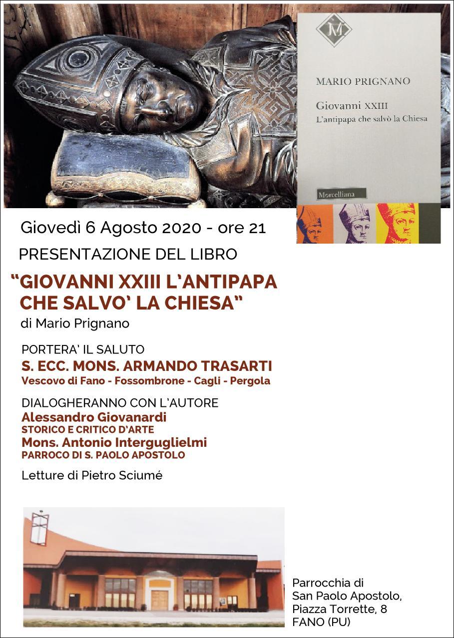 Giovedì 6 agosto, alle ore 21 nella parrocchia San Paolo Apostolo di Torrette di Fano (Piazza Torrette, 8), è in programma la presentazione del libro “Giovanni XXIII. L’antipapa che salvò la Chiesa” di Marco Prignano (Ed. Morcelliana, 2019). Porterà il suo saluto il Vescovo Armando. Dialogheranno con l’autore Alessandro Giovanardi, storico e critico d’arte, e Mons. Antonio Interguglielmi parroco di San Paolo Apostolo di Torrette di Fano. Letture di Pietro Sciumè.