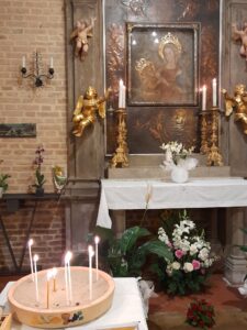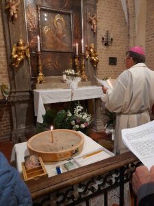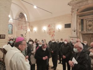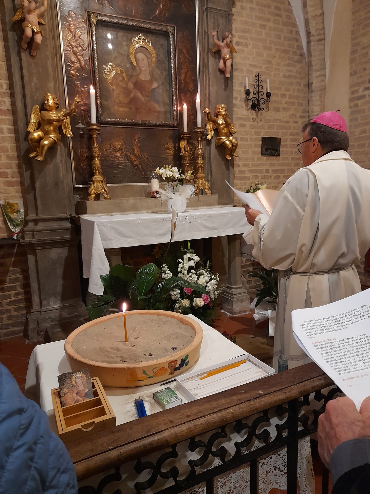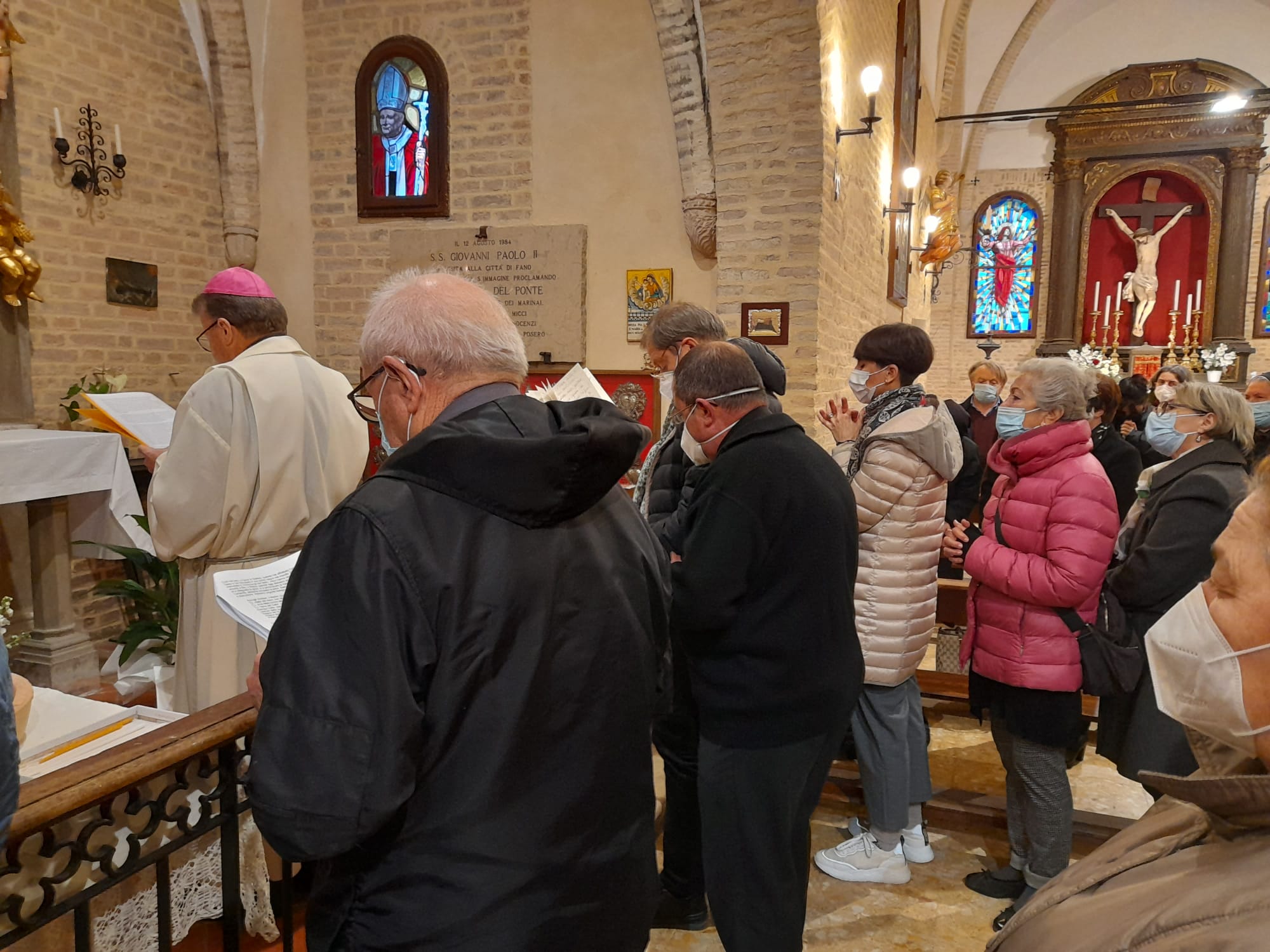 “Tutti i profughi, di qualsiasi terra, portano il loro dolore, il loro fuggire è conseguenza di violenza, di prepotenza. Dovremmo avere sempre un cuore largo e aperto verso tutti”. Così ha esordito il Vescovo Armando, venerdì 25 marzo, nel Santuario della Madonna del Ponte Metauro dove ha affidato, in comunione con Papa Francesco, al Cuore Immacolato di Maria la Russia e l’Ucraina davanti all’immagine della Vergine che San Giovanni Paolo II, nel 1984 in visita a Fano, la incoronò protettrice dei marinai. Dopo l’invito alla preghiera del Vicario per la Pastorale don Francesco Pierpaoli e la recita del Santo Rosario, la meditazione del Vescovo. “Mentre facciamo questa consacrazione della Russia e dell’Ucraina al Cuore Immacolato di Maria – ha proseguito il Vescovo Armando nella sua riflessione –  chiediamoci: siamo veramente donne e uomini di pace a casa, nelle nostre famiglie, nelle parrocchie? Ci sono confini? Forse dovremmo chiedere perdono quando i poveri non sono i nostri fratelli più cari o quando, con il potere della parola o del giudizio, umiliamo qualcuno”. Poi il Vescovo Armando e i presbiteri presenti si sono recati nella cappella dove è custodita l’immagine di Maria e, proprio davanti al quadro, si sono fermati in preghiera insieme ai fedeli, leggendo l’atto di consacrazione alla Vergine.