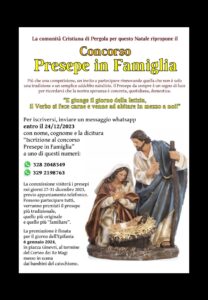 Per il Natale 2023 la comunità cristiana di Pergola ripropone a tutti il concorso “Presepe in famiglia”. Più che una competizione vera e propria è un invito a partecipare rinnovando quella che non è solo una tradizione o un semplice addobbo natalizio. Il presepe è, da sempre, un segno di luce per ricordarci che la nostra speranza è concreta, quotidiana, domestica.