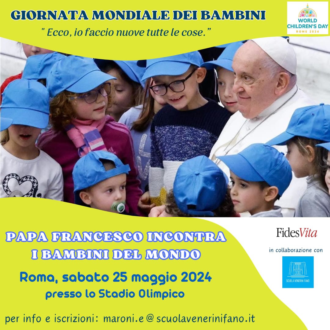 Fides Vita, in collaborazione con la Scuola Venerini Fano, organizza un pullman che partirà proprio da Fano sabato 25 maggio 2024 in occasione della Giornata Mondiale dei Bambini a Roma dove i bambini di tutto il mondo, allo stadio Olimpico, incontreranno Papa Francesco. Si partirà da Fano alle ore 6.30. L’ingresso allo stadio sarà alle ore 12.00 circa. La festa avrà inizio alle ore 15.30 e l’arrivo di Papa Francesco è previsto per le ore 17.00. Dopo le conclusioni delle ore 18.30, il rientro in Ancona sarà previsto intorno a mezzanotte. Quota di partecipazione: 45 euro a persona (sia adulti che bambini). Iscrizioni entro il 26 aprile alla mail maroni.e@scuolavenerinifano.it