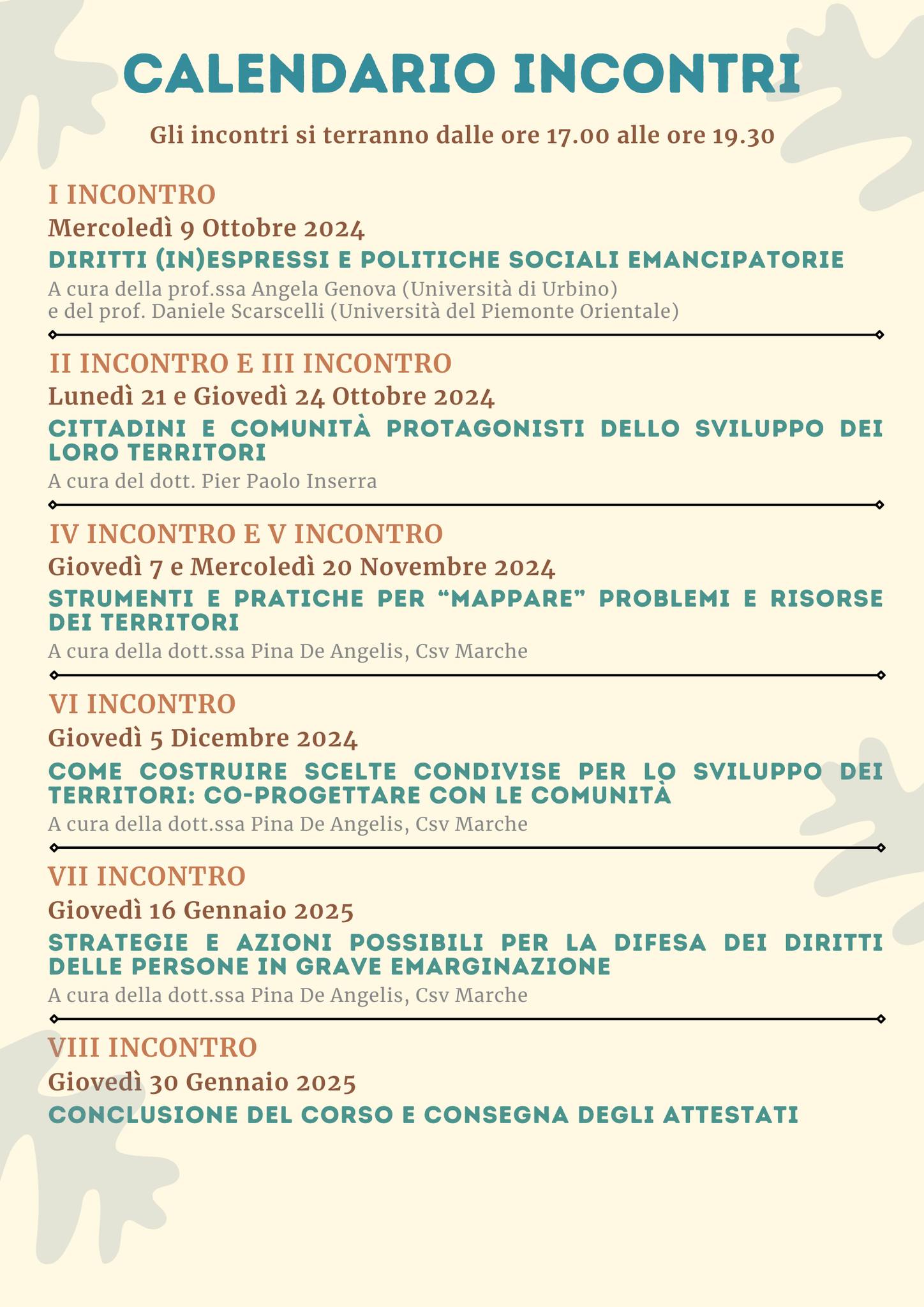 Il corso di formazione sarà incentrato, principalmente, sulle modalità di progettazione e attivazione di processi partecipativi e di azioni collettive locali in relazione al tema dei diritti e della grave
