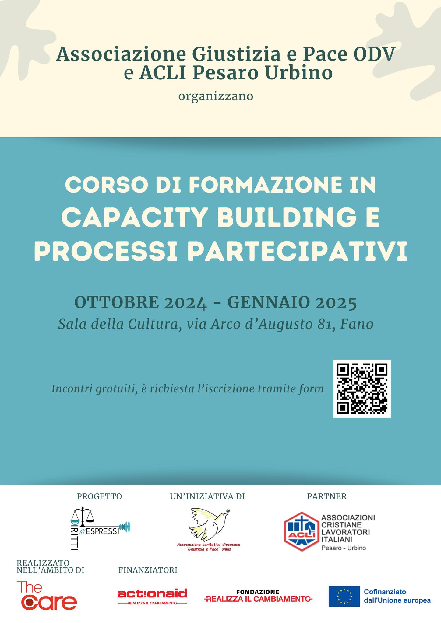 Acli Pesaro e Urbino organizza, all’interno del progetto “Diritti (in)espressi” in collaborazione con l’Associazione Giustizia e Pace Odv, il corso di formazione in “Capacity Building e processi partecipativi”. Il corso avrà inizio a ottobre 2024 e terminerà a gennaio 2025 per un totale di 20 ore. Sono previsti otto incontri, tenuti da diversi/e docenti, che si terranno in presenza presso la Sala della Cultura del Comune di Fano (Via Arco d’Augusto, 81), dalle ore 17 alle 19.30.