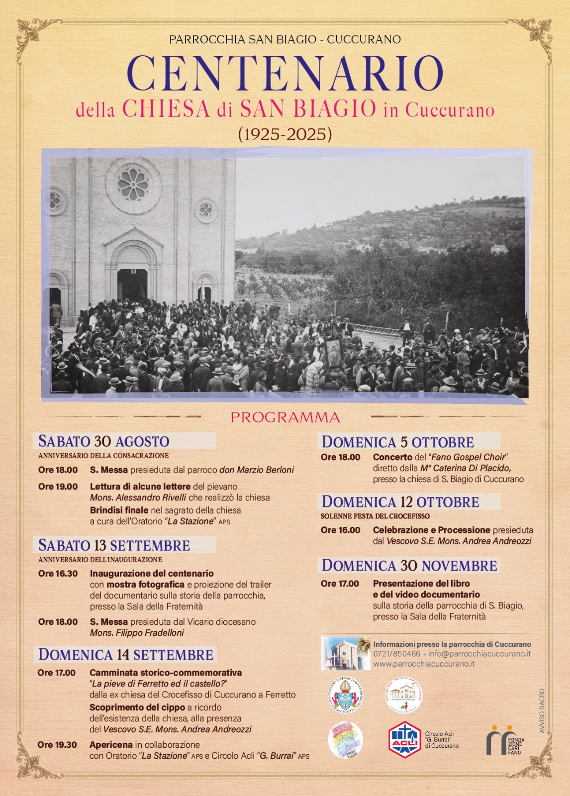 Un traguardo importante quello che la comunità di Cuccurano festeggerà a partire da sabato 30 agosto: i 100 anni della chiesa di San Biagio (1925-2025). Tante sono le iniziative in programma a cominciare da sabato 30 agosto, anniversario della consacrazione della chiesa.