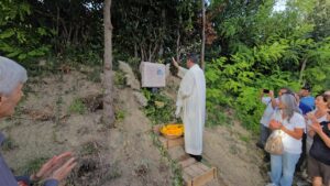 Il pomeriggio di domenica 14 settembre ha visto la presenza del Vescovo Mons. Andrea Andreozzi che ha scoperto e benedetto, a Ferretto, il cippo a ricordo dell’esistenza della chiesa. Tante sono state le persone che hanno partecipato alla camminata storico – commemorativa dall’ex chiesa del Crocifisso di Cuccurano a Ferretto, camminata che il pievano faceva anche tre volte al giorno per raggiungere la chiesa e il paese. “Giacobbe – ha esordito il Vescovo – poggia il capo su una pietra e fa un sogno: sogna la casa di Dio. Anche noi, oggi, scoprendo questo cippo commemorativo ricordiamo il sogno dei nostri predecessori che pensarono alla casa di Dio in mezzo agli uomini e a una storia di salvezza portata avanti da Dio. Oggi raccogliamo questo sogno, ringraziando il Signore di tutto ciò che ci ha donato per realizzarlo. Noi sentiamo la responsabilità di portarlo avanti e di continuare il cammino che da qui è iniziato”.