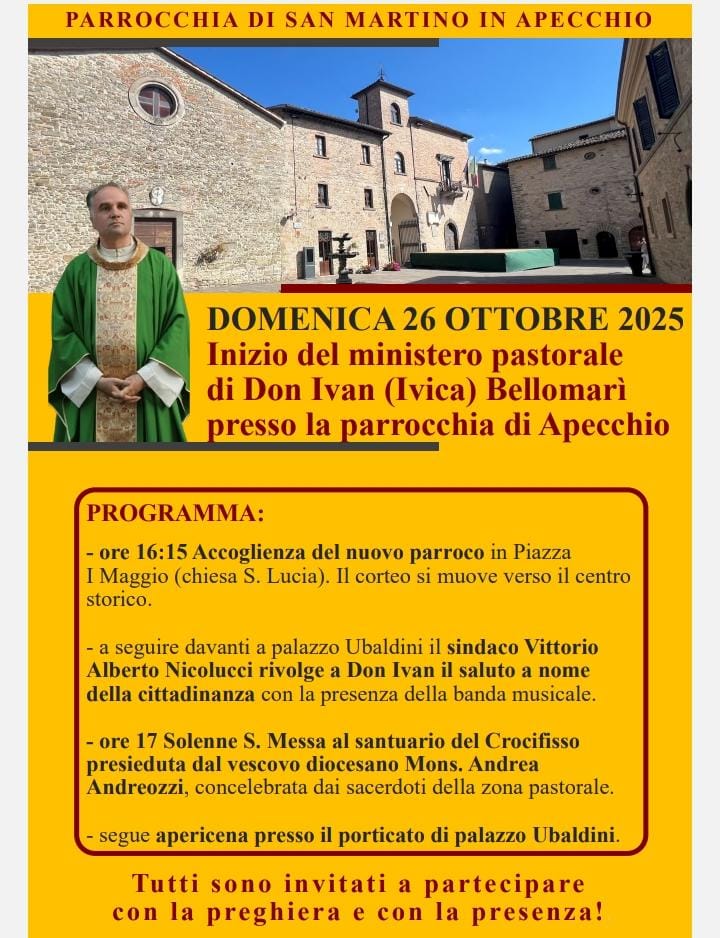 Domenica 26 ottobre, presso la parrocchia di Apecchio, don Ivan (Ivica) Bellomarì inizierà il suo ministero pastorale. Il programma prevede: alle ore 16.15, l’accoglienza del nuovo parroco in piazza I Maggio (chiesa S. Lucia). Il corteo si muoverà, poi, verso il centro storico. A seguire, davanti a palazzo Ubaldini il sindaco Vittorio Alberto Nicolucci rivolgerà a don Ivan il saluto a nome della cittadinanza alla presenza della banda musicale. Alle ore 17.00 il Vescovo Andrea celebrerà la Santa Messa al Santuario del Crocifisso concelebrata dai sacerdoti della zona pastorale. Seguirà un momento conviviale presso il porticato di palazzo Ubaldini.