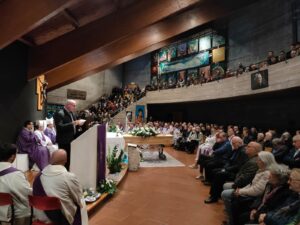 Il Vescovo si è poi soffermato sul Vangelo che narra di Gesù intento ad andare verso Gerusalemme. Qualcuno vuole mettergli fretta, suggerirgli di allontanarsi subito perché qualcuno cerca di ucciderlo. “Il Signore Gesù, però – ha sottolineato il Vescovo – scandisce bene il suo tempo, il tempo della Pasqua nella nostra vita perché la nostra vita è un passaggio attraverso il mistero di Cristo, attraverso la Sua morte e risurrezione. Oggi, domani e il terzo giorno sono il tempo che ci è dato di vivere all’insegna di Cristo nostra Pasqua e abbiamo tempo per operare secondo la volontà di Dio”. Mons. Andreozzi ha ricordato anche il primo incontro con don Piergiorgio. “Appena arrivato qui erano i giorni del suo 50esimo di sacerdozio e abbiamo avuto la gioia di poterlo celebrare in questa comunità. Io gli dissi che quando uno arriva a 50 anni di Messa il contachilometri si azzera e lui questa frase l’ha ripresa più volte. Oggi il tempo si è azzerato perché diventa il tempo di Dio, dell’eternità, della pienezza della vita”.