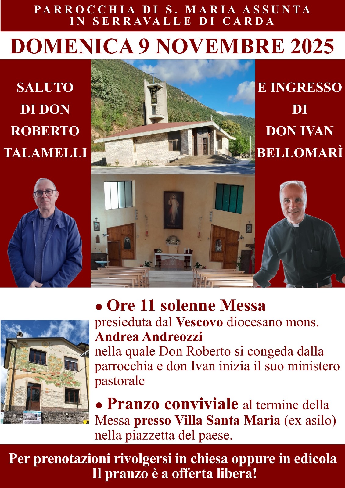 Domenica 9 novembre don Ivan farà il suo ingresso a Serravalle di Carda quale parroco di Santa Maria Assunta. Il programma prevede, alle ore 11.00, la Santa Messa presieduta dal Vescovo Andrea. Nella stessa celebrazione del mandato al nuovo parroco ci sarà il saluto di quello uscente, don Roberto Talamelli, che si congederà dalla comunità dopo un lungo periodo di tempo trascorso insieme. Al termine della celebrazione eucaristica ci sarà il pranzo conviviale nella piazzetta del paese, nei locali dell’ex asilo di Villa Santa Maria.