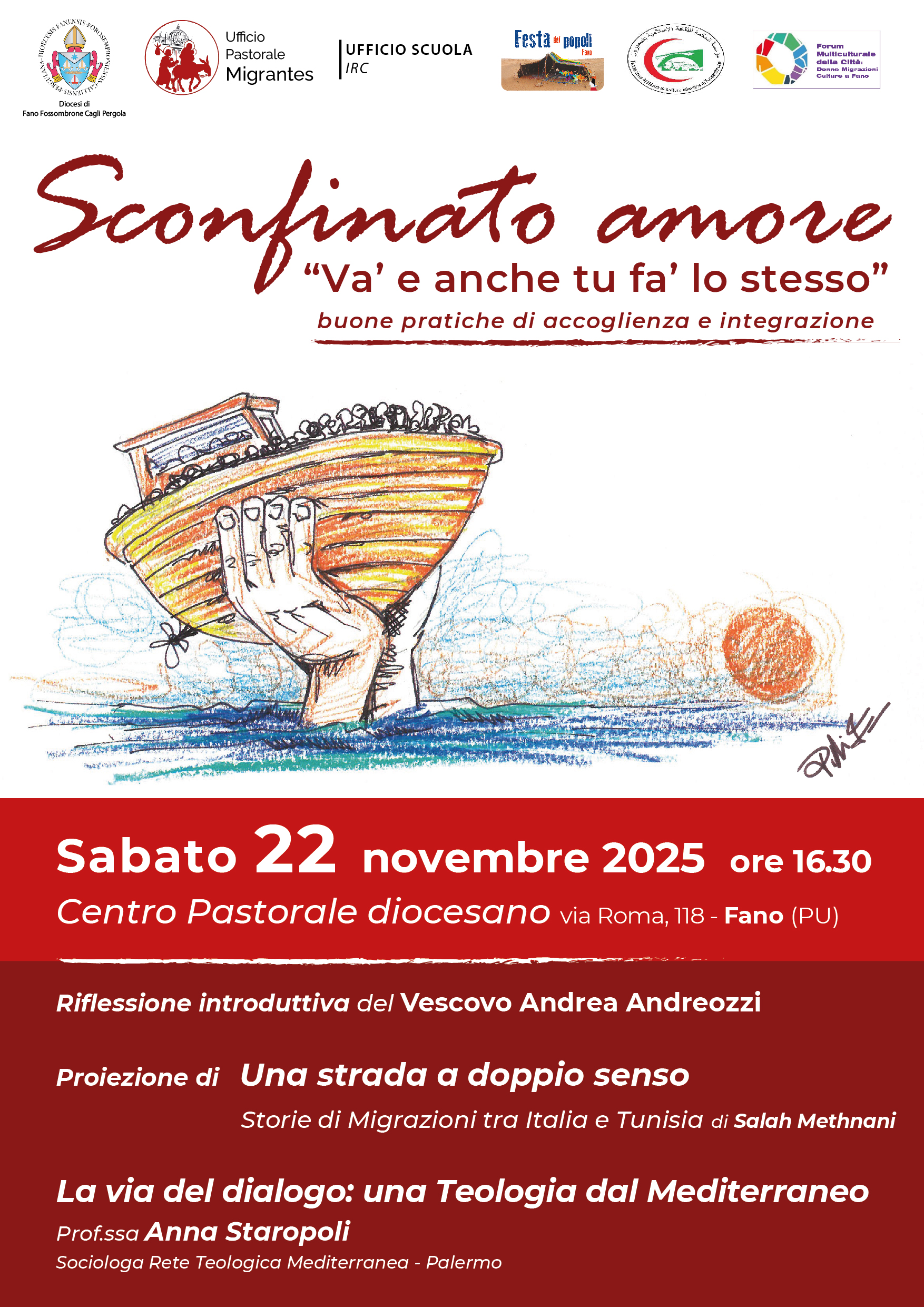 “Sconfinato amore. Buone pratiche di accoglienza e integrazione” è il titolo dell’iniziativa in programma sabato 22 novembre, alle ore 16.30, al Centro Pastorale Diocesano, organizzata dall’Ufficio Diocesano Migrantes, dall’Ufficio Scuola, dalla Festa dei Popoli, da Fondazione Al Hikma di cultura islamica di Fossombrone e dal Forum Multiculturale della Città.