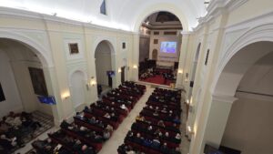 La parola è, poi, passata al Vescovo Andrea, il quale, dopo aver ringraziato il Prof. Del Bene e richiamato la Lettera Apostolica di Papa Leone XIV “Disegnare nuove mappe di speranza”, si è soffermato sul Documento Finale del Sinodo, approvato ufficialmente dai vescovi italiani il 19 novembre in Assisi. “Il lievito – come ha detto Mons. Andreozzi – esprime il processo della presenza terrena del Regno nel mondo. Anche il sinodo, sia quello della Chiesa universale che quello della Chiesa italiana, è stato un evento importante e significativo che ha la qualità di essere un lievito nella vita della Chiesa. La sinodalità è la direzione che viene data con chiarezza al termine di un lungo processo. Pace e speranza sono le due sponde entro le quali la chiesa si muove in questo tempo e permettono di avvicinare le tante sofferenze causate dalla violenza della guerra”. Il vescovo, infine, ha tracciato alcune linee per il cammino della diocesi: lo stile sinodale da acquisire nel tempo della ricezione; il discernimento sulla situazione di alcune zone pastorali dove è venuta meno la figura del parroco; la revisione attenta del servizio svolto dagli uffici di curia; la cura delle vocazioni al ministero ordinato e alla ministerialità laicale; la valorizzazione della Scuola di Pace.