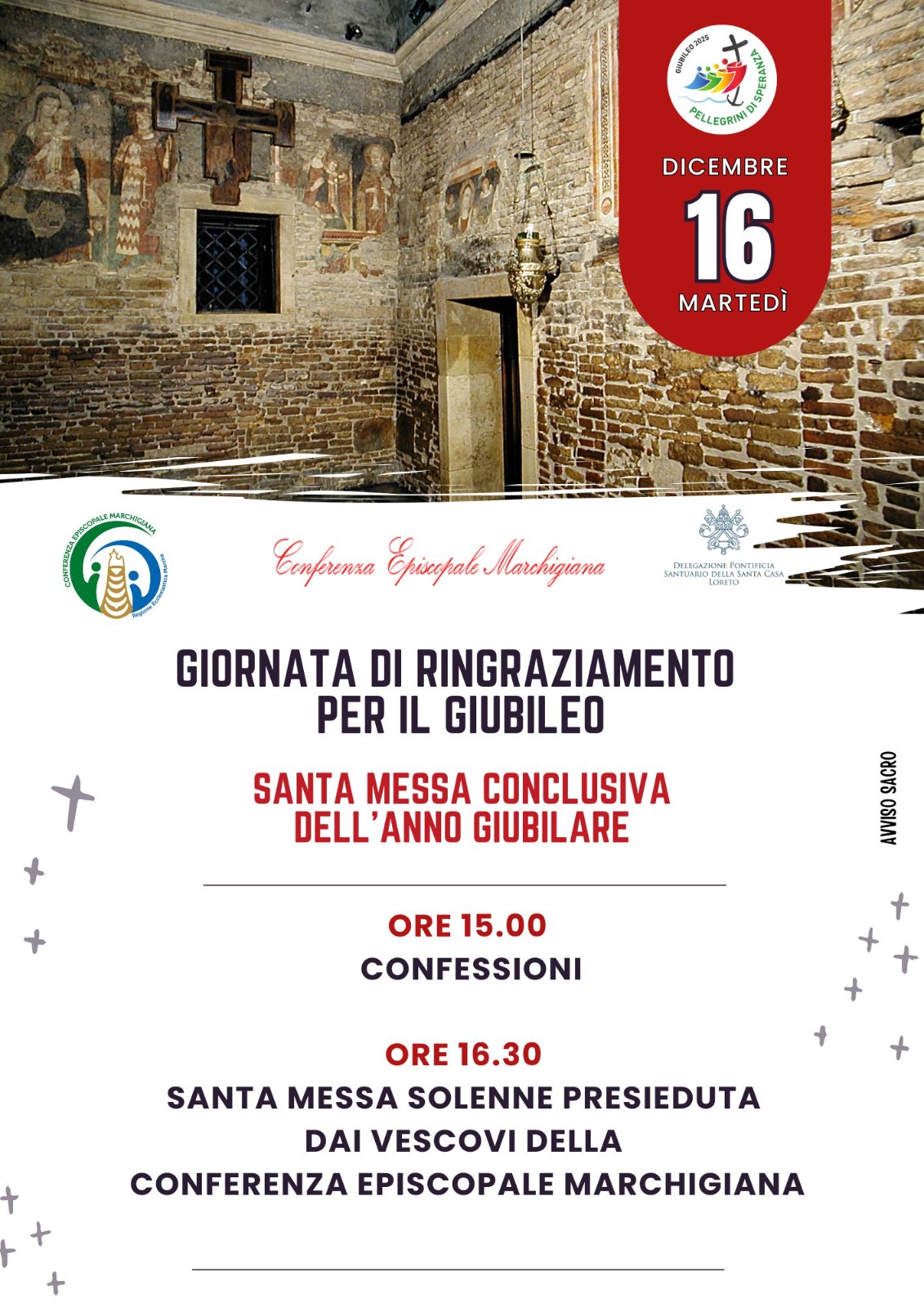 Martedì 16 dicembre, alle ore 16.30 in occasione della Giornata di ringraziamento per il Giubileo, è in programma la Santa Messa solenne conclusiva dell’anno giubilare presieduta dai vescovi della Conferenza Episcopale Marchigiana. Alle ore 15.00 ci saranno le confessioni.
