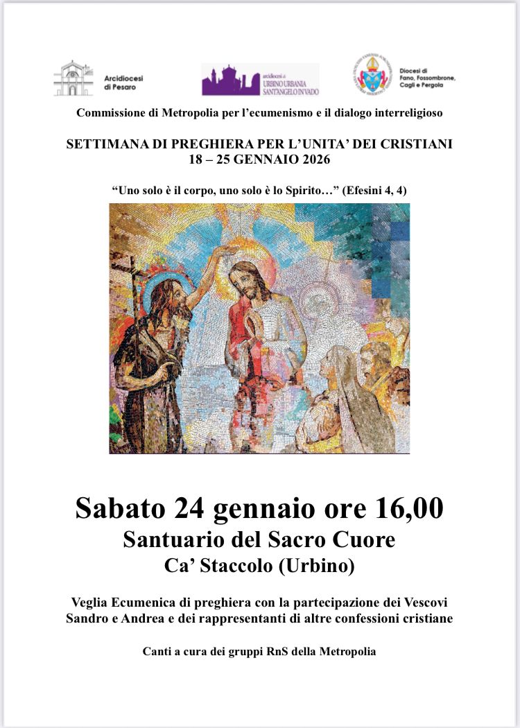 In occasione della Settimana di Preghiera per l’Unità dei Cristiani (18-25 gennaio 2026), la Commissione di Metropolia per l’ecumenismo e il dialogo interreligioso organizza sabato 24 gennaio, alle ore 16.00 presso il Santuario del Sacro Cuore a Ca’ Staccolo (Urbino), la Veglia Ecumenica di preghiera con la partecipazione dei Vescovi Sandro e Andrea e dei rappresentanti di altre confessioni cristiane.