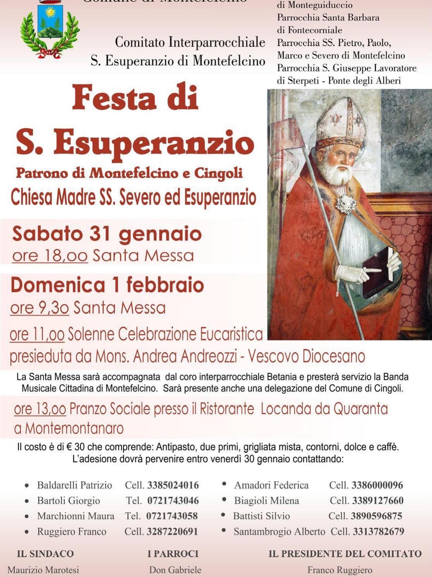 Domenica 1 febbraio, presso la chiesa madre SS. Severo ed Esuperanzio, si celebra la Festa di Sant’Esuperanzio, patrono di Montefelcino e Cingoli. Il programma prevede sabato 31 gennaio, alle ore 18.00, la celebrazione della Santa Messa, mentre domenica 1 febbraio, alle ore 9.00, si terrà la Santa Messa, mentre alle ore 11.00 la Solenne Concelebrazione Eucaristica sarà presieduta dal Vescovo Andrea. La Santa Messa sarà accompagnata dal coro interparrocchiale Betania e presterà servizio la banda musicale cittadina di Montefelcino. Sarà presente anche una delegazione del comune di Cingoli. Alle ore 13.00 è previsto il pranzo sociale.