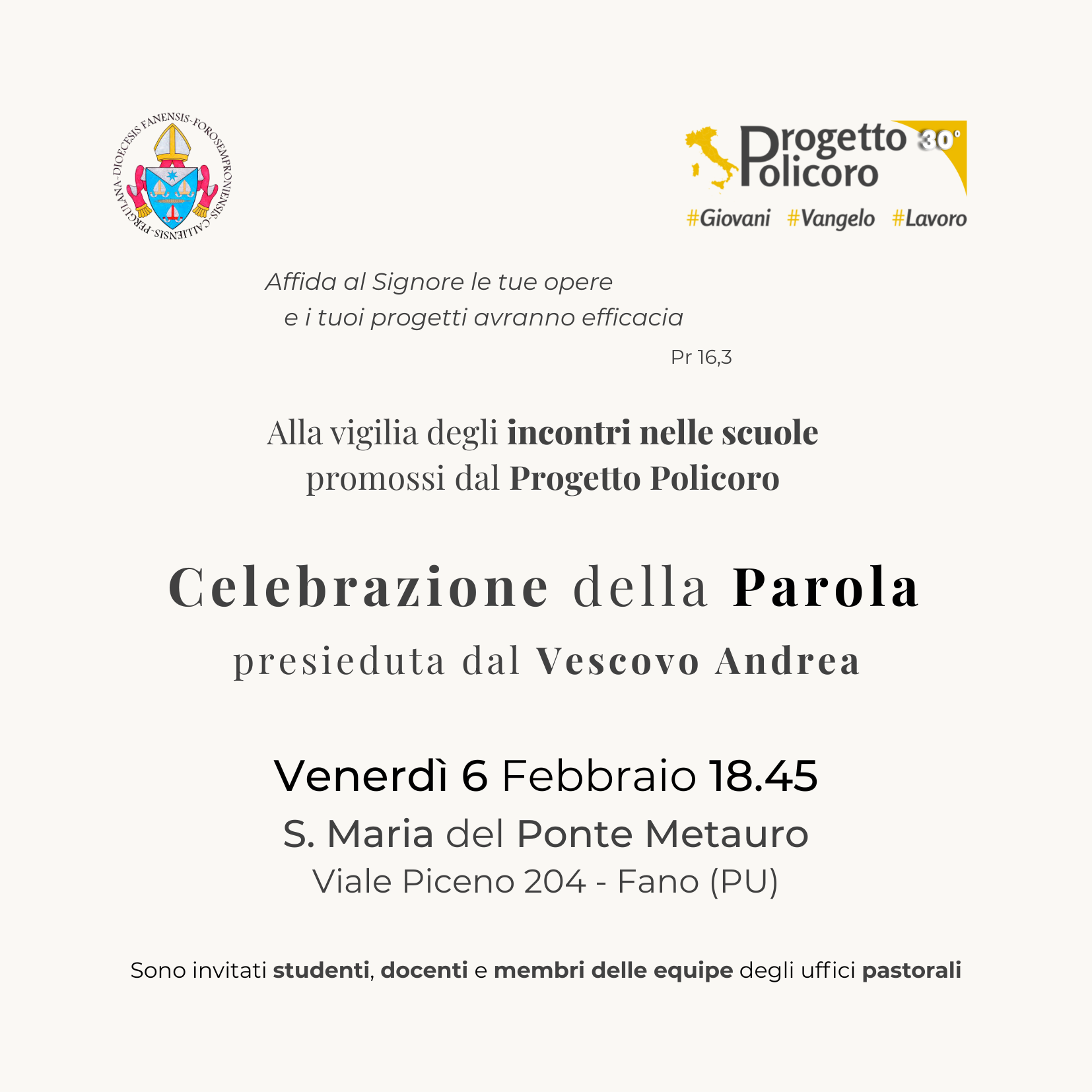 Venerdì 6 febbraio, alle ore 18.45 a Santa Maria del Ponte Metauro alla vigilia degli incontri nelle scuole promossi dal Progetto Policoro, è in programma la Celebrazione della Parola presieduta dal Vescovo Andrea. Sono invitati studenti, docenti e membri dell’equipe degli uffici diocesani