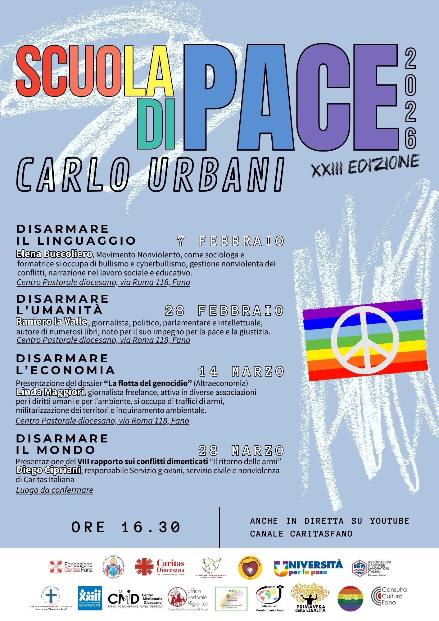 A febbraio riprendono a Fano gli appuntamenti della Scuola di Pace “Carlo Urbani”, il ciclo di incontri su pace, giustizia, nonviolenza e salvaguardia del creato, giunta alla XXIII edizione. Il programma di quest’anno affronta il tema del disarmo, alla luce della crescente spinta al riarmo a cui si assiste a livello internazionale e prendendo come riferimento il messaggio di Papa Leone XIV per la LIX Giornata mondiale della pace dello scorso 1 gennaio 2026.