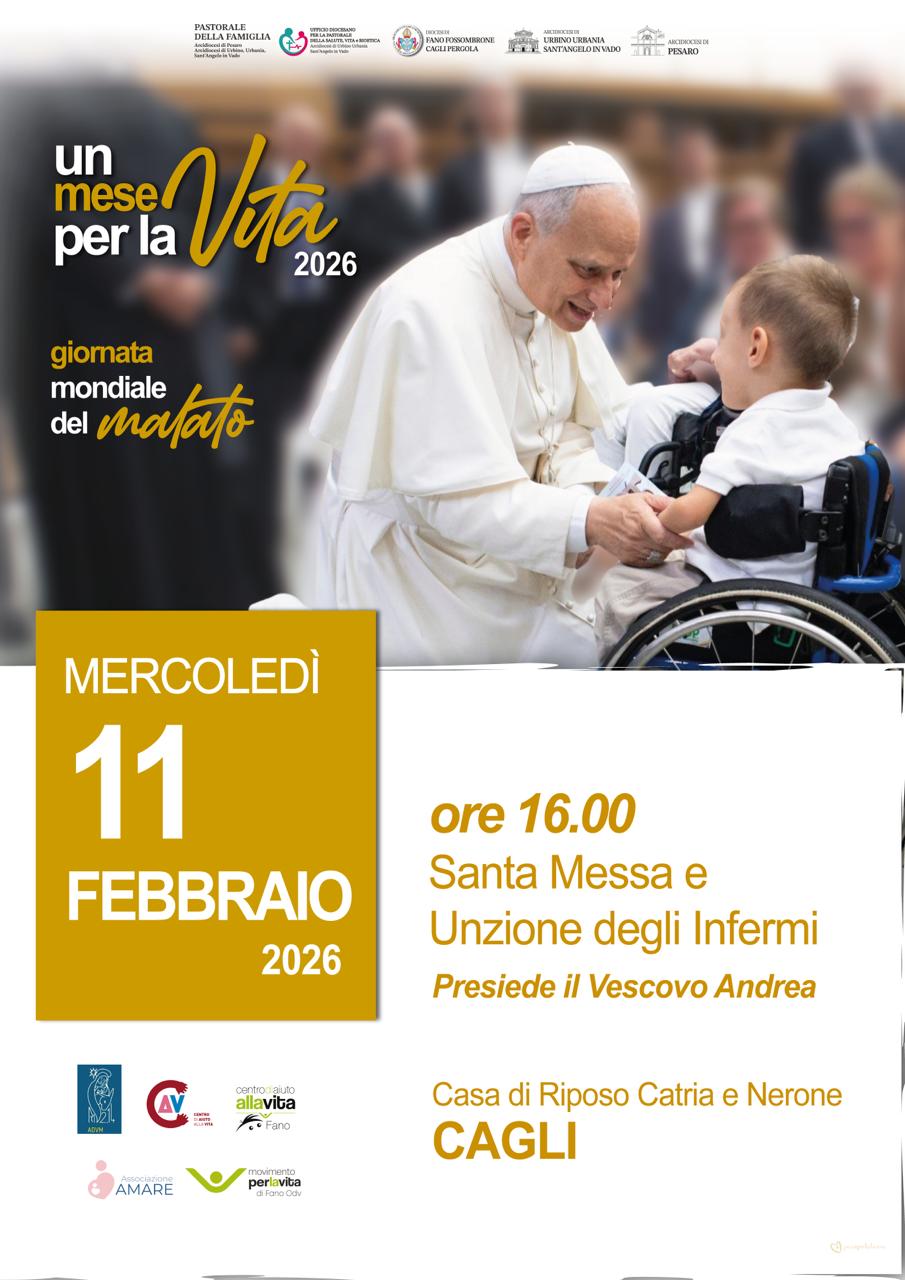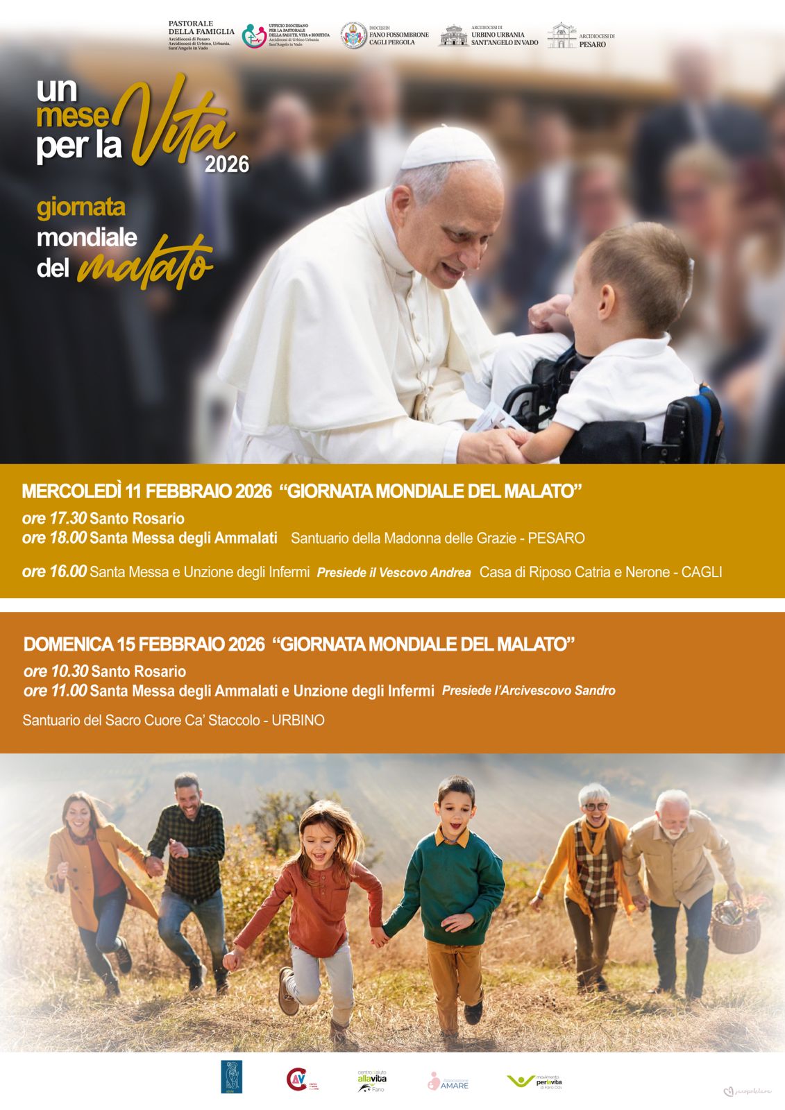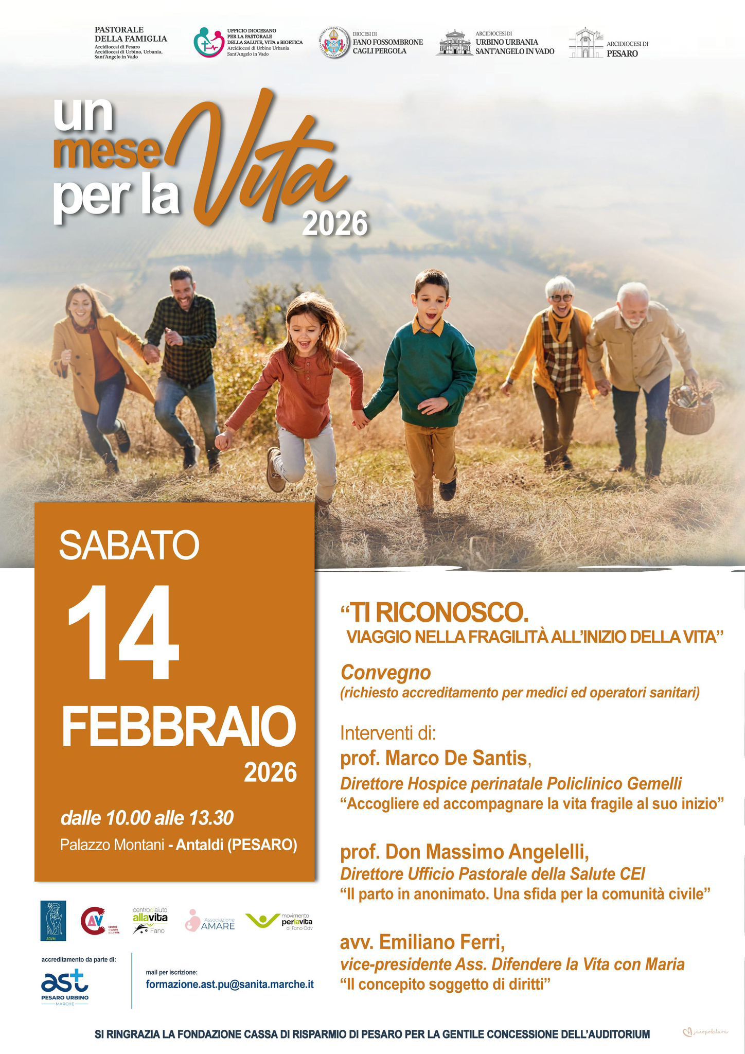 Proseguono gli appuntamenti in occasione del mese per la Vita. Mercoledì 11 febbraio, Giornata Mondiale del Malato, alle ore 17.30 verrà recitato il Santo Rosario e alle ore 18.00 sarà celebrata la Santa Messa per tutti i malati presso il Santuario della Madonna delle Grazie a Pesaro , mentre alle ore 16.00 il Vescovo Andrea presiederà la Santa Messa con l’Unzione degli Infermi nella casa di riposo Catria e Nerone di Cagli. Sabato 14 febbraio, dalle ore 10.00 alle ore 13.30 a Palazzo Montani Antaldi di Pesaro, è in programma il convegno “Ti riconosco. Viaggio nella fragilità all’inizio della vita”. Interverranno il professor Marco De Santis direttore dell’hospice perinatale del Policlinico Gemelli, il professor Massimo Angelelli direttore dell’Ufficio Pastorale della Salute CEI e l’avvocato Emiliano Ferri vice presidente dell’associazione Difendere la Vita con Maria. Domenica 15 febbraio, alle ore 10.30, è in programma la recita del Santo Rosario e alle ore 11.00 la Santa Messa per i malati con l’Unzione degli Infermi sarà presieduta dall’Arcivescovo Sandro presso il Santuario del Sacro Cuore di Ca’ Staccolo a Urbino. Giovedì 26 febbraio, alle ore 21.00 presso la Parrocchia di San Francesco Cappuccini di Pesaro si terrà la “preghiera per la vita” presieduta dall’Arcivescovo Sandro. A marzo ci sarà un incontro pubblico sulla giornata per la vita a Urbino.