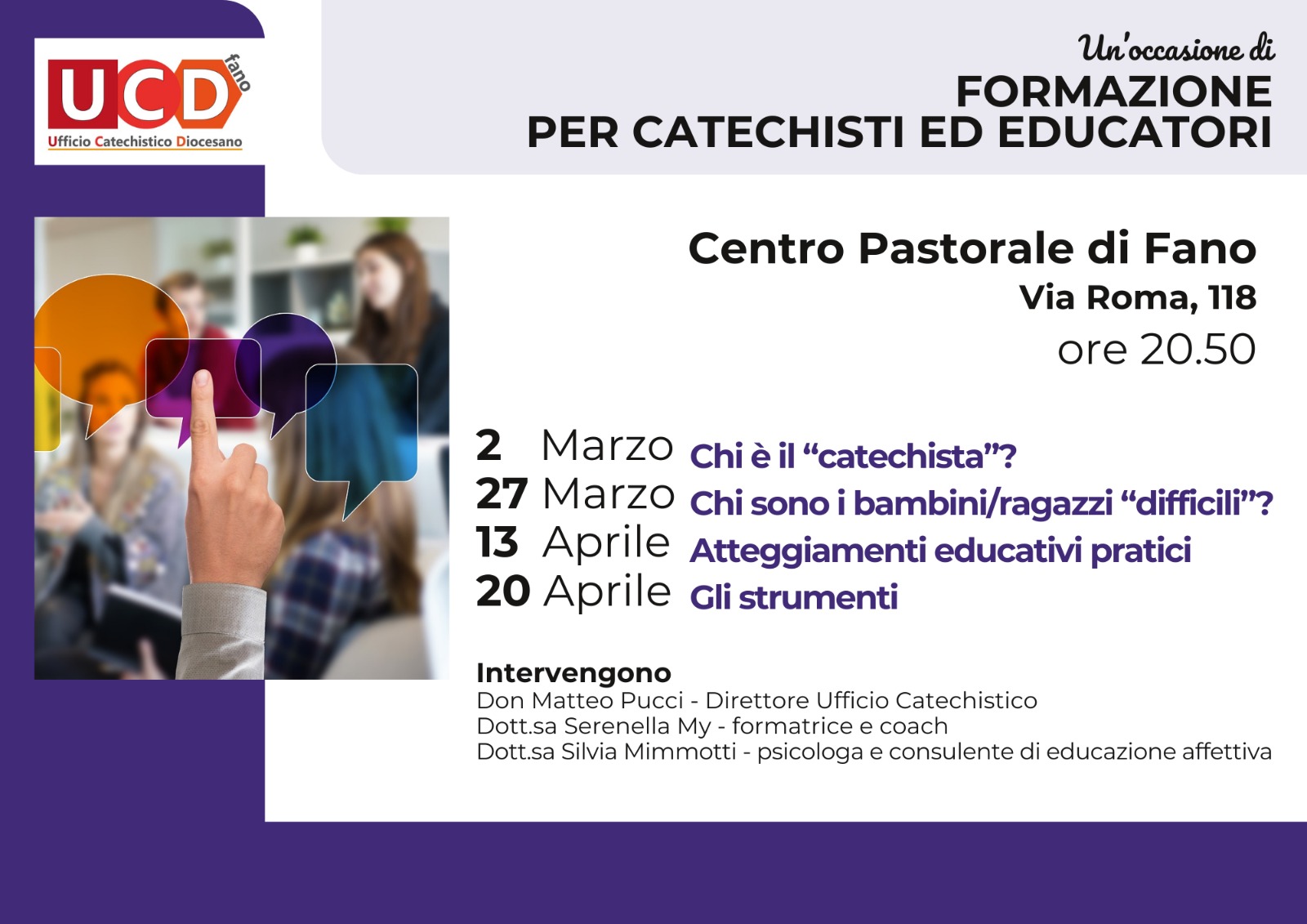 L’Ufficio Catechistico Diocesano organizza una serie di incontri per catechisti ed educatori alle ore 20.50 presso il Centro Pastorale Diocesano. Le date sono le seguenti: il 2 marzo si parlerà di “Chi è il catechista?”, il 27 marzo “Chi sono i bambini/ragazzi “difficili”?”, il 13 aprile spazio a “Atteggiamenti educativi pratici” e il 20 aprile si parlerà de “Gli strumenti”. Interverranno don Matteo Pucci, direttore dell’Ufficio Catechistico Diocesano, Serenella My, formatrice e coatch e Silvia Mimmotti psicologa e consulente di educazione affettiva.