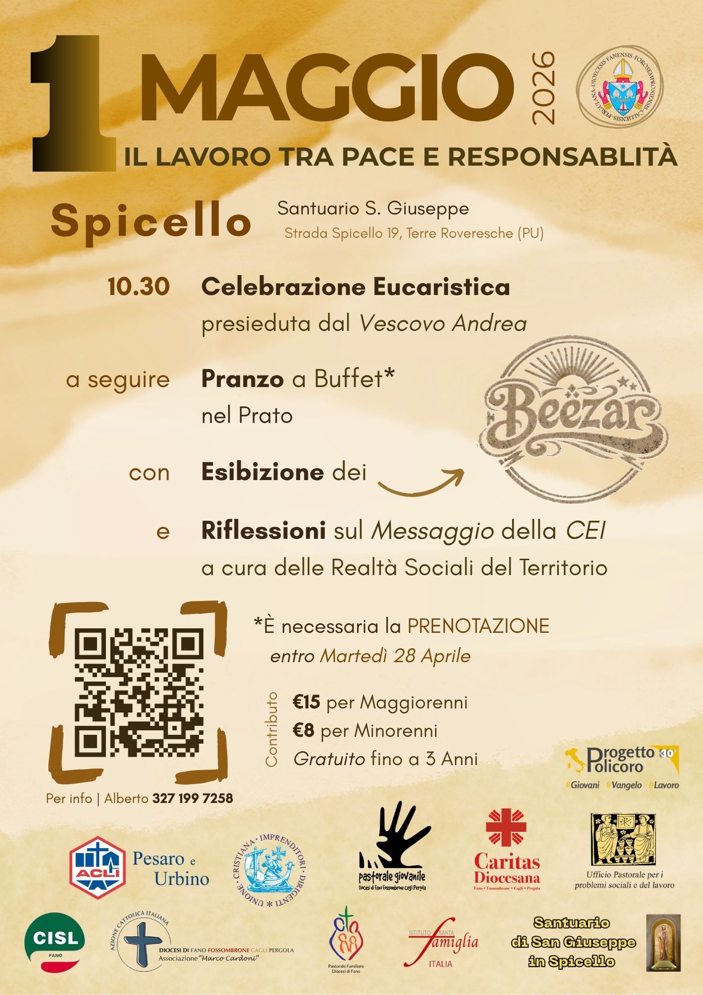 “Il lavoro tra pace e responsabilità” è il tema dell’iniziativa, organizzata in occasione della Festa di San Giuseppe Lavoratore, in programma venerdì 1 maggio presso il Santuario di San Giuseppe a Spicello. Il programma prevede alle ore 10.30 la celebrazione eucaristica presieduta dal Vescovo Andrea, a seguire pranzo a buffet con esibizione dei Beezar e riflessioni sul Messaggio della CEI a cure della Realtà Sociali del Territorio. Per il pranzo occorre prenotarsi al seguente link https://forms.gle/FwPCCTPjpinSiS9L8