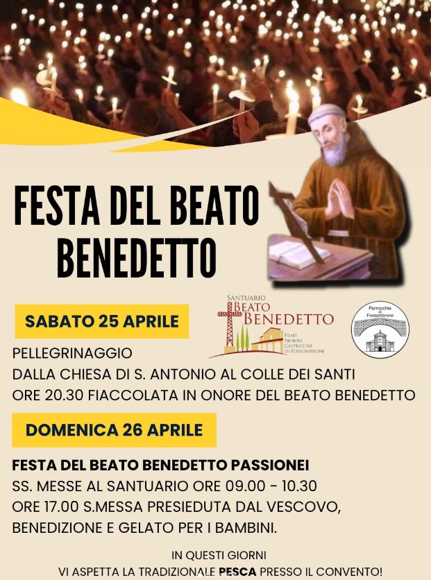 Domenica 26 aprile, presso il convento dei Cappuccini di Fossombrone, è in programma la Festa del Beato Benedetto Passionei. Il programma prevede alle ore 9.00 e alle ore 10.30 la Santa Messa, alle ore 17.00 la Santa Messa sarà presieduta dal Vescovo Andrea. Al termine la benedizione a tutti i bambini. In preparazione alla festa, sabato 25 aprile si terrà il pellegrinaggio dalla chiesa di S. Antonio al Colle dei Santi e alle ore 20.30 ci sarà la fiaccolata in onore del Beato Benedetto.