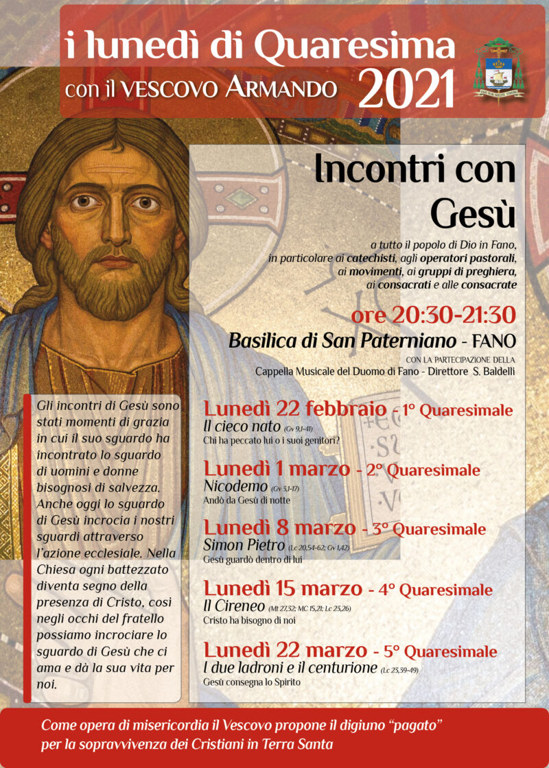 Da lunedì 22 febbraio, dalle ore 20.30 alle ore 21.30 nella Basilica di San Paterniano, si terranno i lunedì di Quaresima con il Vescovo Armando con la partecipazione della Cappella Musicale del Duomo di Fano diretta dal M° Stefano Baldelli.