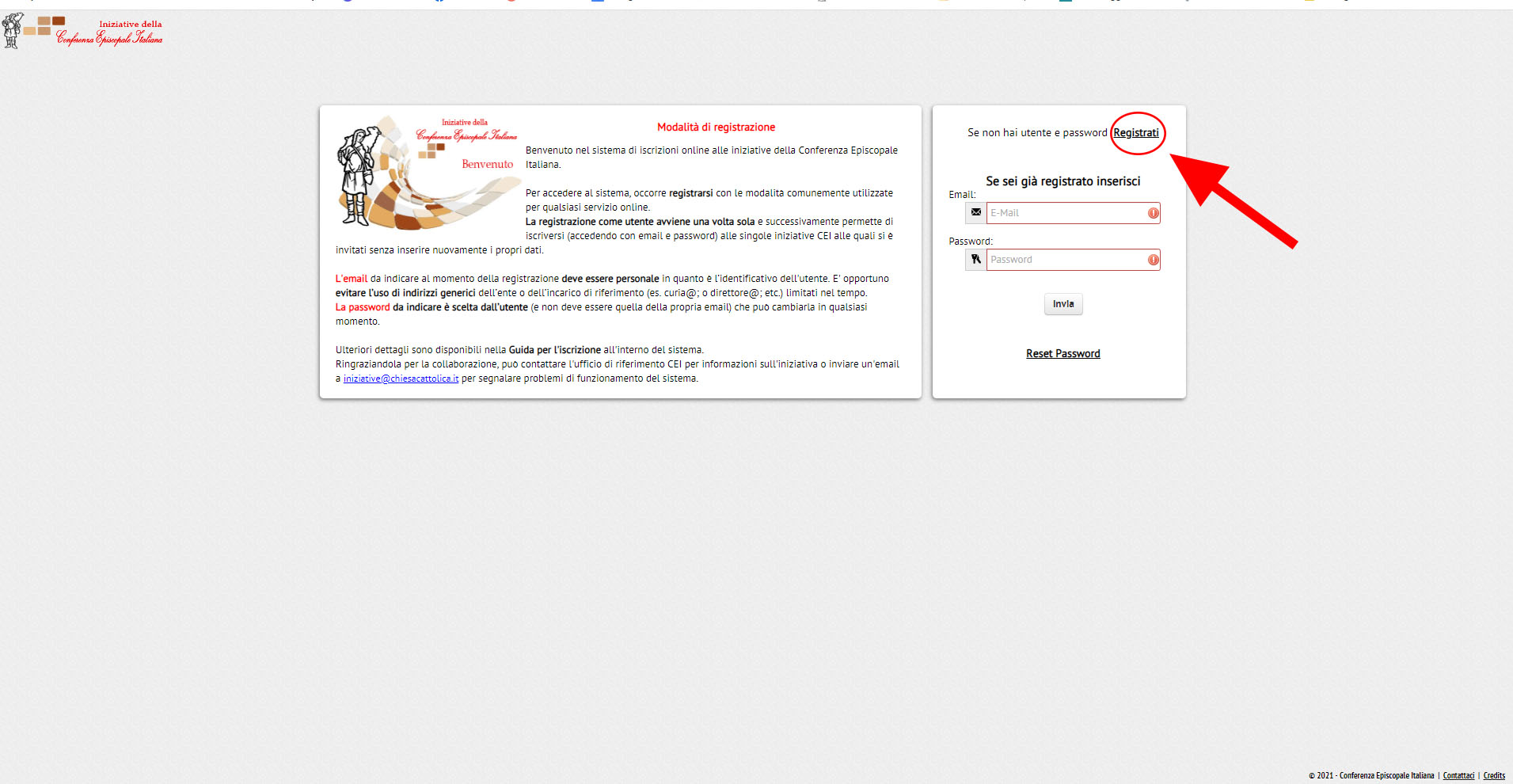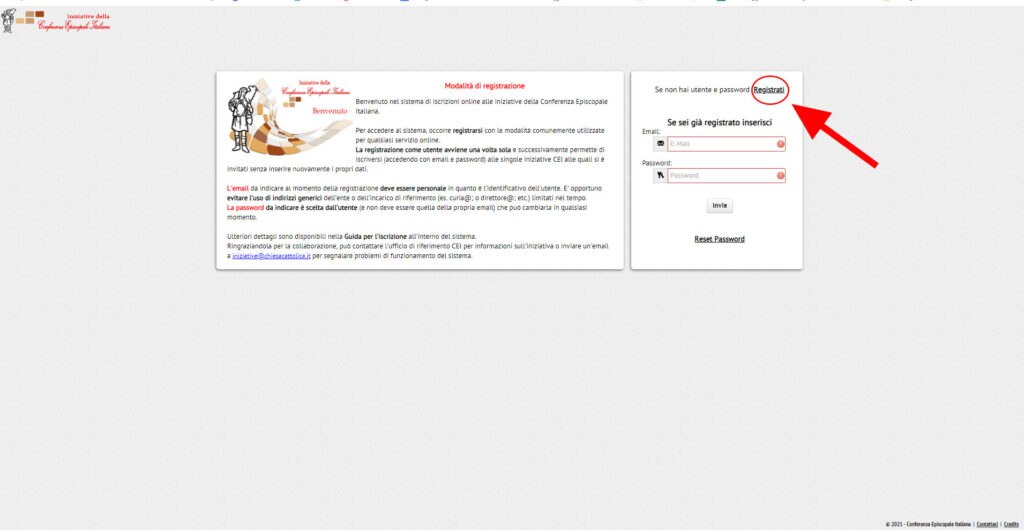 - Cliccare quindi sul bottone registrati come indicato nella figura seguente: