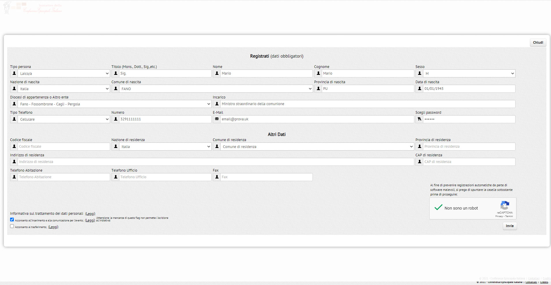 2. Compilare tutti i campi con i propri dati, indicato la diocesi di Fano Fossombrone Cagli Pergola, il ruolo in diocesi la propria email e scegliere una password: