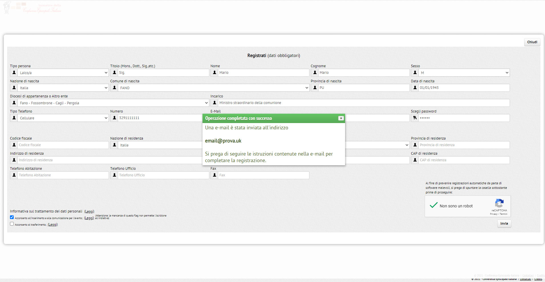 L’email da indicare al momento della registrazione deve essere personale in quanto è l’identificativo dell’utente. E’ opportuno evitare l’uso di indirizzi generici dell’ente o dell’incarico di riferimento (es. curia@; o direttore@; etc.) limitati nel tempo.