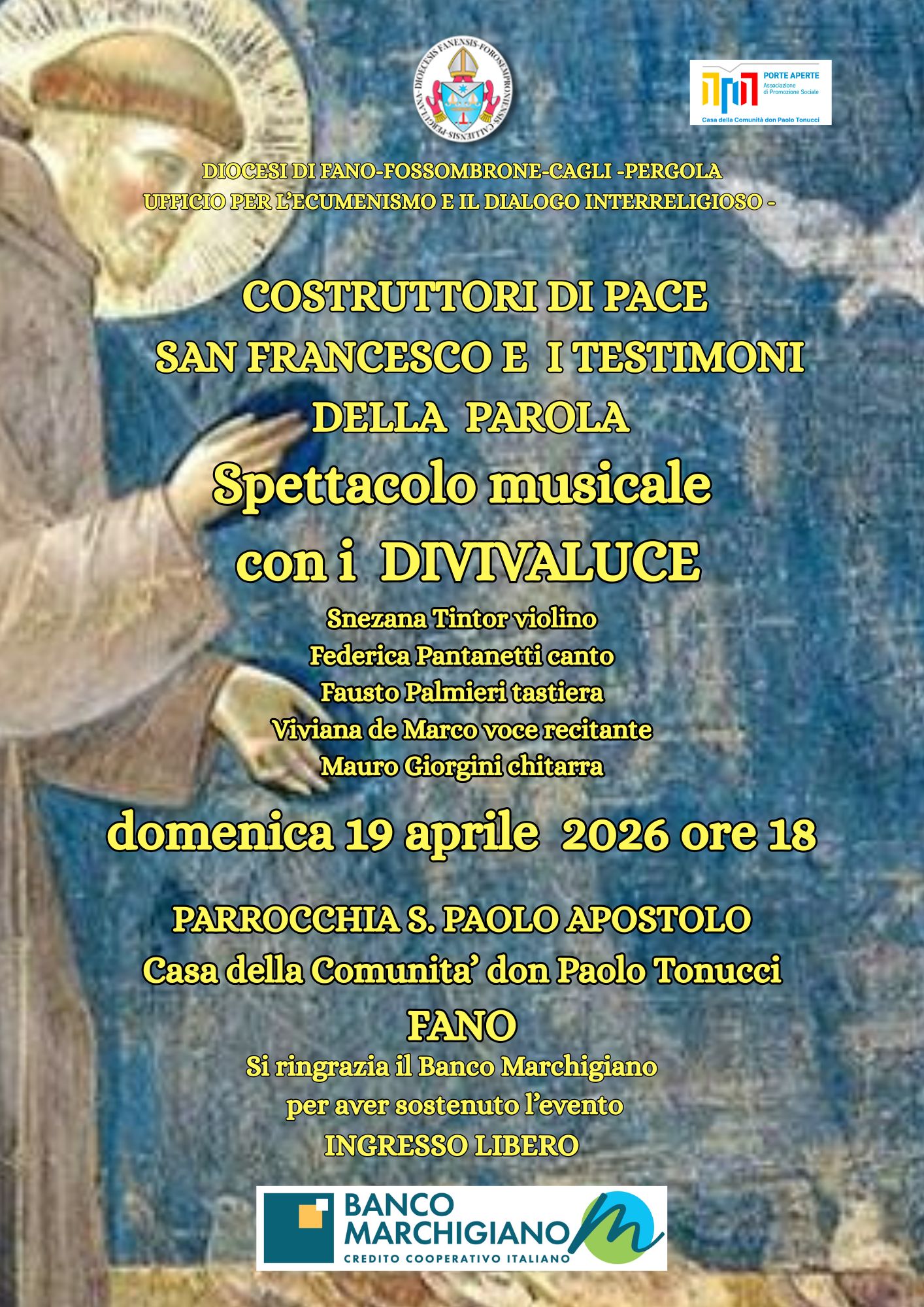Domenica 19 aprile, alle ore 18.00 nella casa della comunità Don Paolo Tonucci della parrocchia San Paolo Apostolo al Vallato, è in programma lo spettacolo musicale con i Divivaluce dal titolo “Costruttori di pace. San Francesco e i testimoni della parola”. Si esibiranno Snezana Tintor al violino, Federica Pantanetti al canto, Fausto Palmieri alla tastiera, Viviana De Marco voce recitante e Mauro Giorgini alla chitarra. L’iniziativa, sostenuta dal Banco Marchigiano e a ingresso libero, è organizzata dall’Ufficio Diocesano per l’Ecumenismo e il Dialogo Interreligioso in collaborazione con l’associazione “Porte Aperte”.